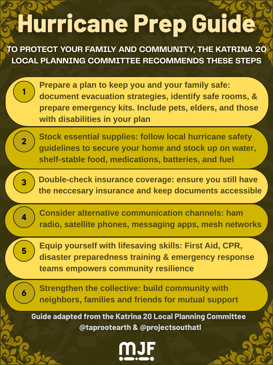 Review MJF’s preparedness plan for disasters, created by our Senior Organizing Fellow, Sabrina Akbar that we have linked here.