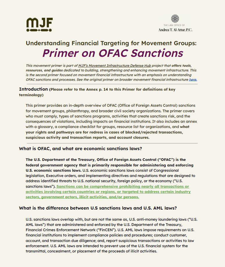 This primer provides an in-depth overview of OFAC (Office of Foreign Assets Control) sanctions for movement groups, philanthropy, and broader civil society organizations. The primer covers who must comply, types of sanctions programs, activities that create sanctions risk, and the consequences of violations, including impacts on financial institutions. It also includes an annex with a glossary, a compliance checklist for groups, a resource list for organizations, and what your rights and pathways are for redress in cases of blocked/rejected transactions, suspicious activity and transaction reports, and account closures.