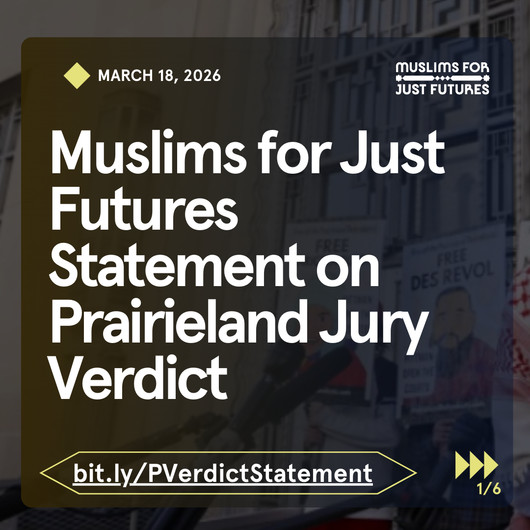 Muslims for Just Futures is deeply concerned about the impact of the Prairieland case on the right to protest, freedom of speech, assembly, and more broadly, for anyone critical of the government. This verdict raises critical questions about the weaponization of federal “material support for terrorism” statutes not only against those engaged in protest activity, but potentially against anyone whose political views, associations, or criticisms place them at odds with the government.