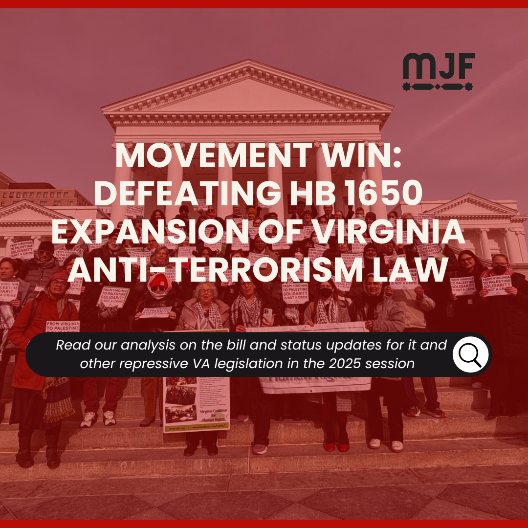 MJF joined movement partners at the Virginia Coalition of Human Rights to lobby against H.B. 1650 and other bills that weaponized anti-terrorism tactics against students and public institutions of higher education.